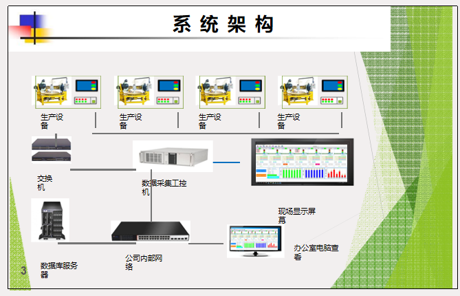 現場顯示:采用大尺寸屏幕,實時顯示設備狀態和生產狀況,可在辦公室電腦查看。