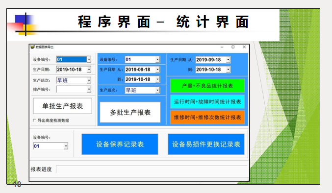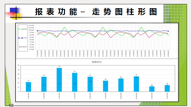 有豐富的統計功能,對于產量、不良品按時間進行統計,統計維修時間、維修次數、停 機時間、停機次數、運行時間,這些龐大的基礎數據進行歸類,可以為決策者制定生產 和設備改善計劃提供強大的數據支持。
