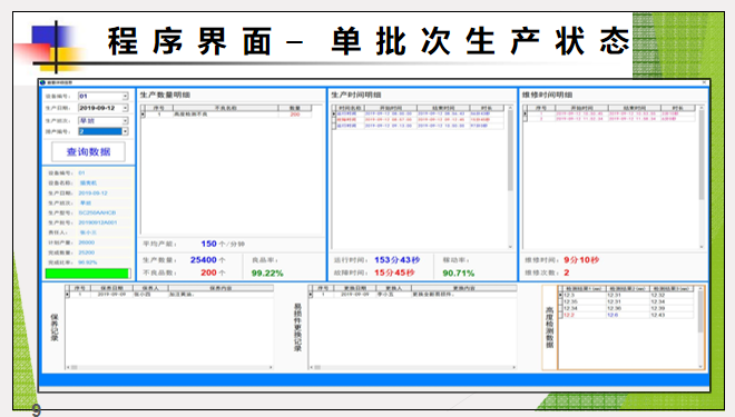 可以記錄每個生產批次的生產數量、不良數量、停機時間、運行時間、維修時間、維修 次數,可以記錄設備的保養和易損件更換。