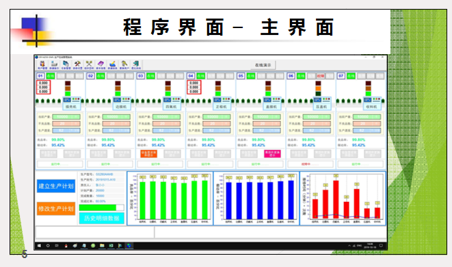 顯示生產線當前的生產狀況。 顯示設備當前的運行狀態。 記錄設備的停機、故障、維修、運行的時間和次數,記錄設備的測量數據。 根據設備的保養周期提前預警設備保養。 根據設